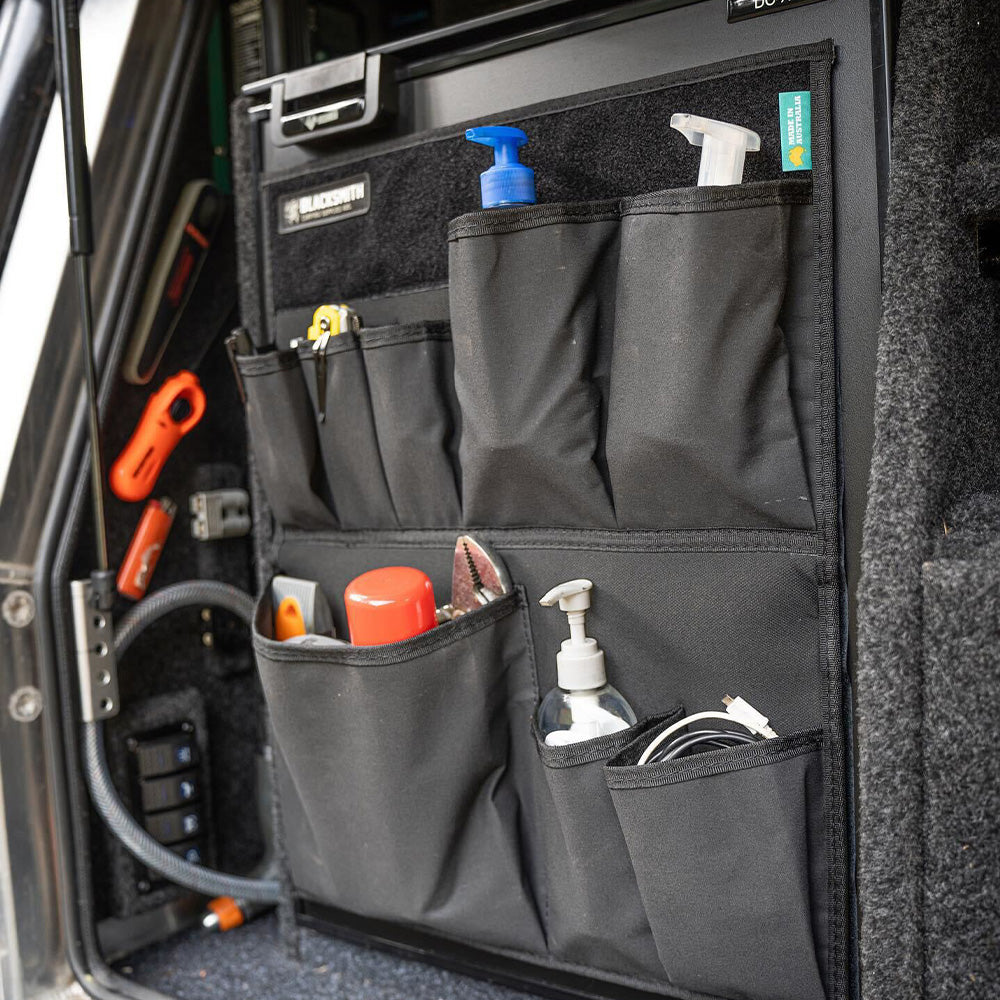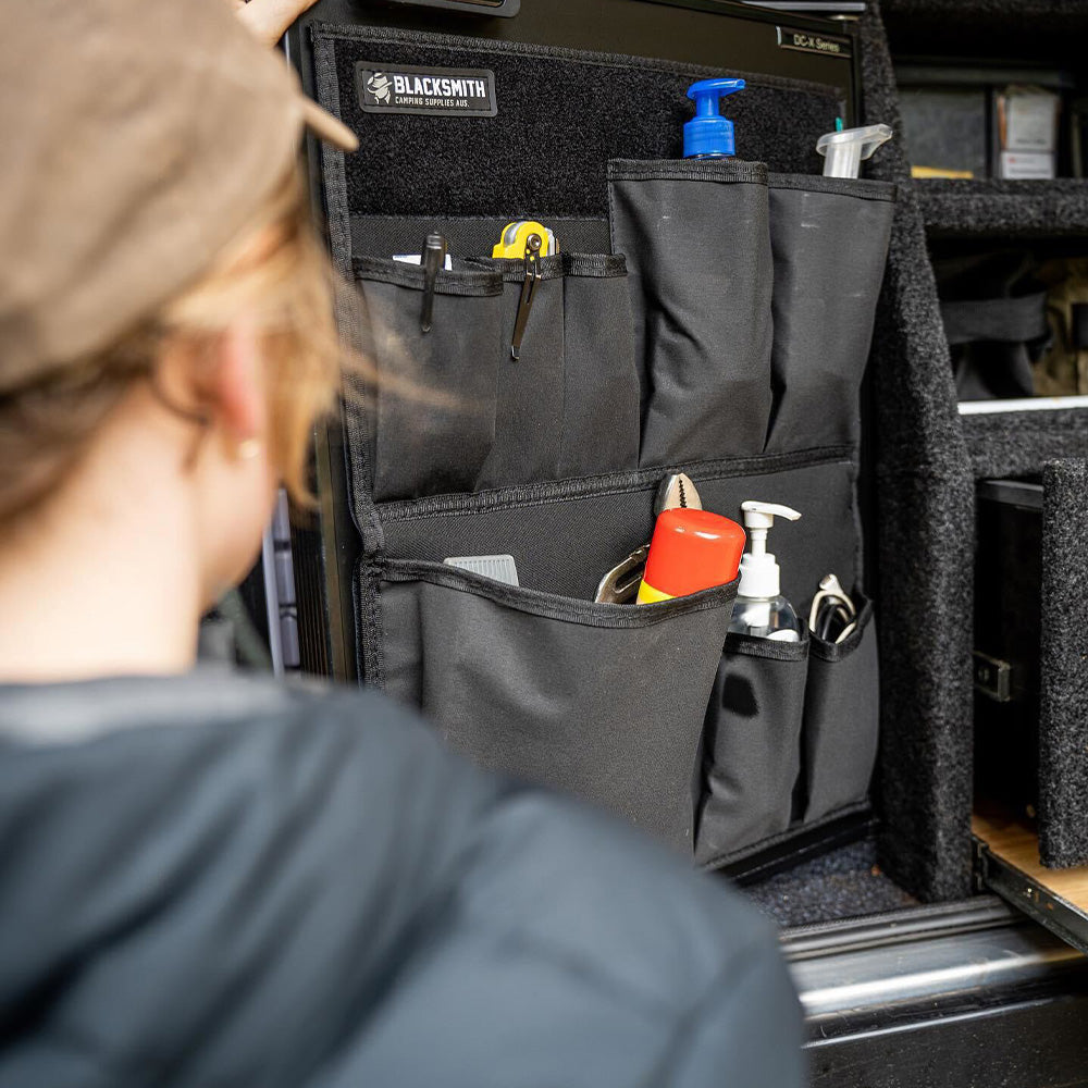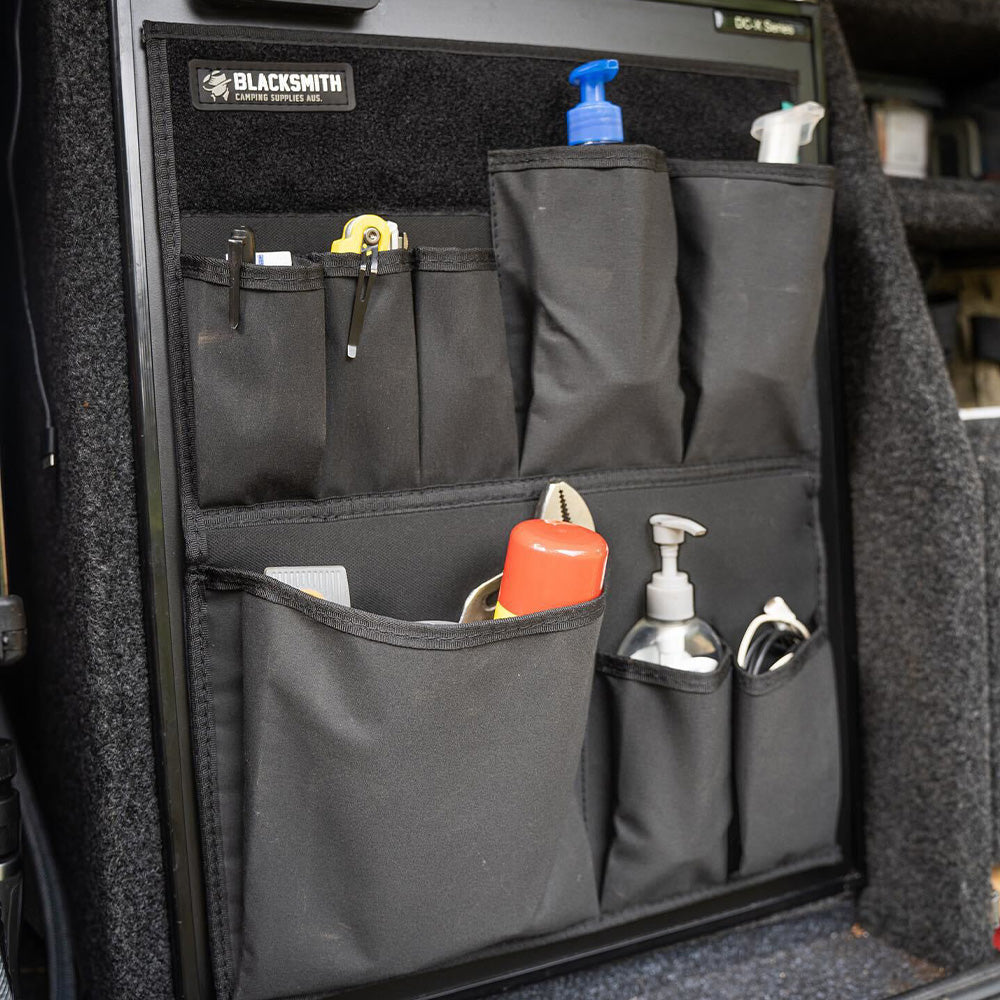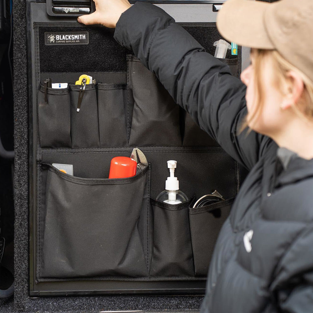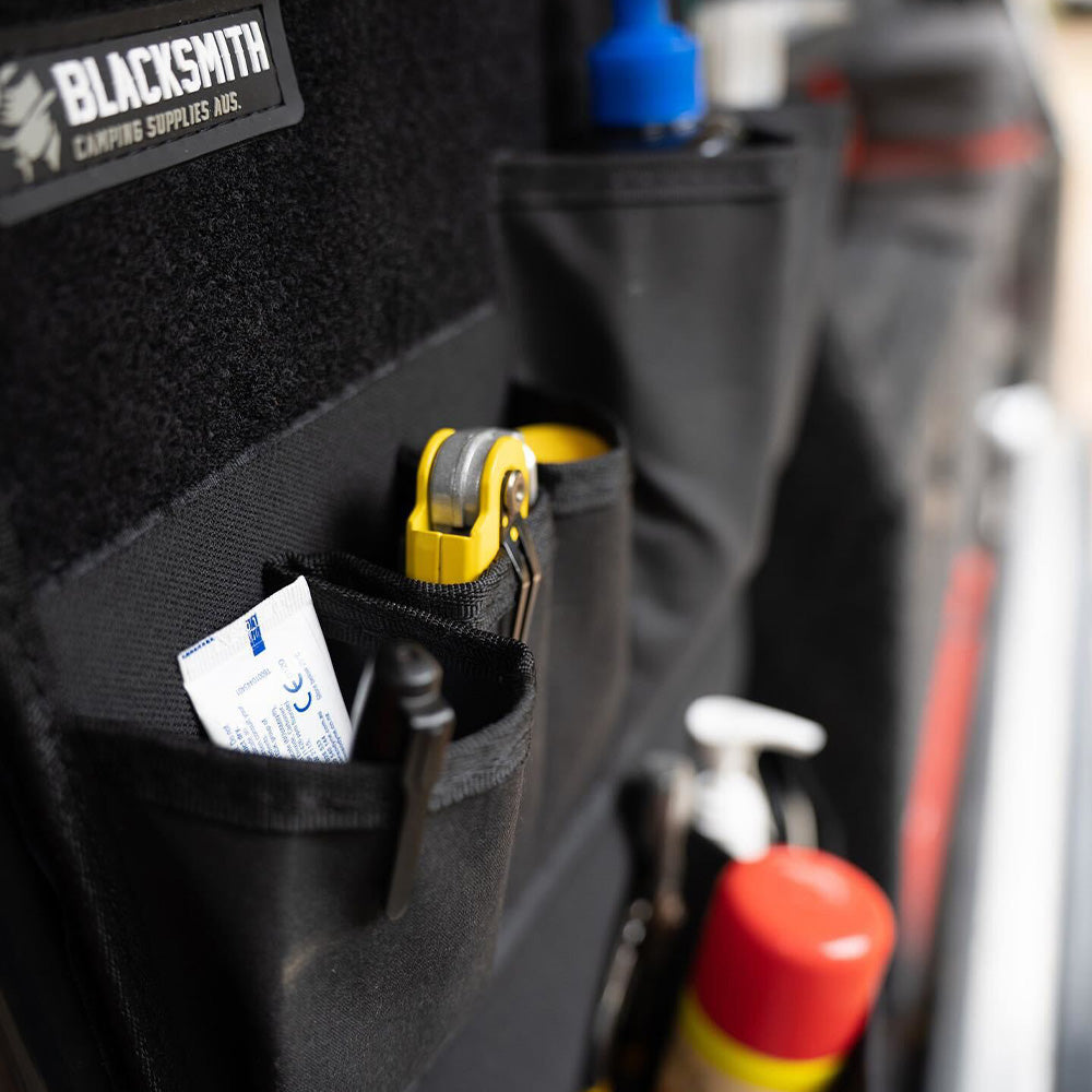 - 2 large bottom pockets (ideas; larger utensils, torch, wine glasses, sanitiser)